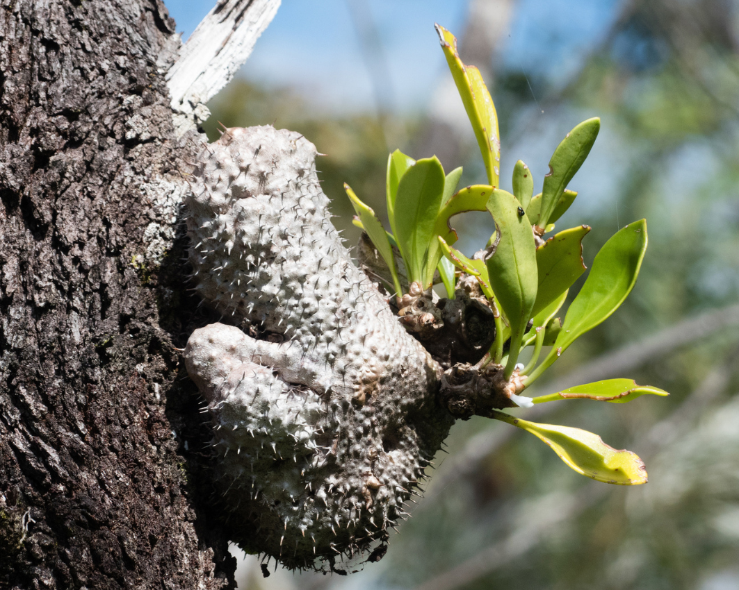 The Myrmecodia beccarii, known as the ant plant, is an epiphytic plant that grows on Melaleuca trees and other trees with spongy bark in the wetlands and mangroves of tropical north Queensland, Australia, from Cooktown to Mission Beach. Its prickly and swollen caudex forms natural hollows that are colonised by the golden ant (Philidris cordatus) in a mutualistic relationship — a type of symbiosis where both species benefit. The ants patrol the plant to remove leaf-eaters, and the plant absorbs their waste as a source of nutrients.
