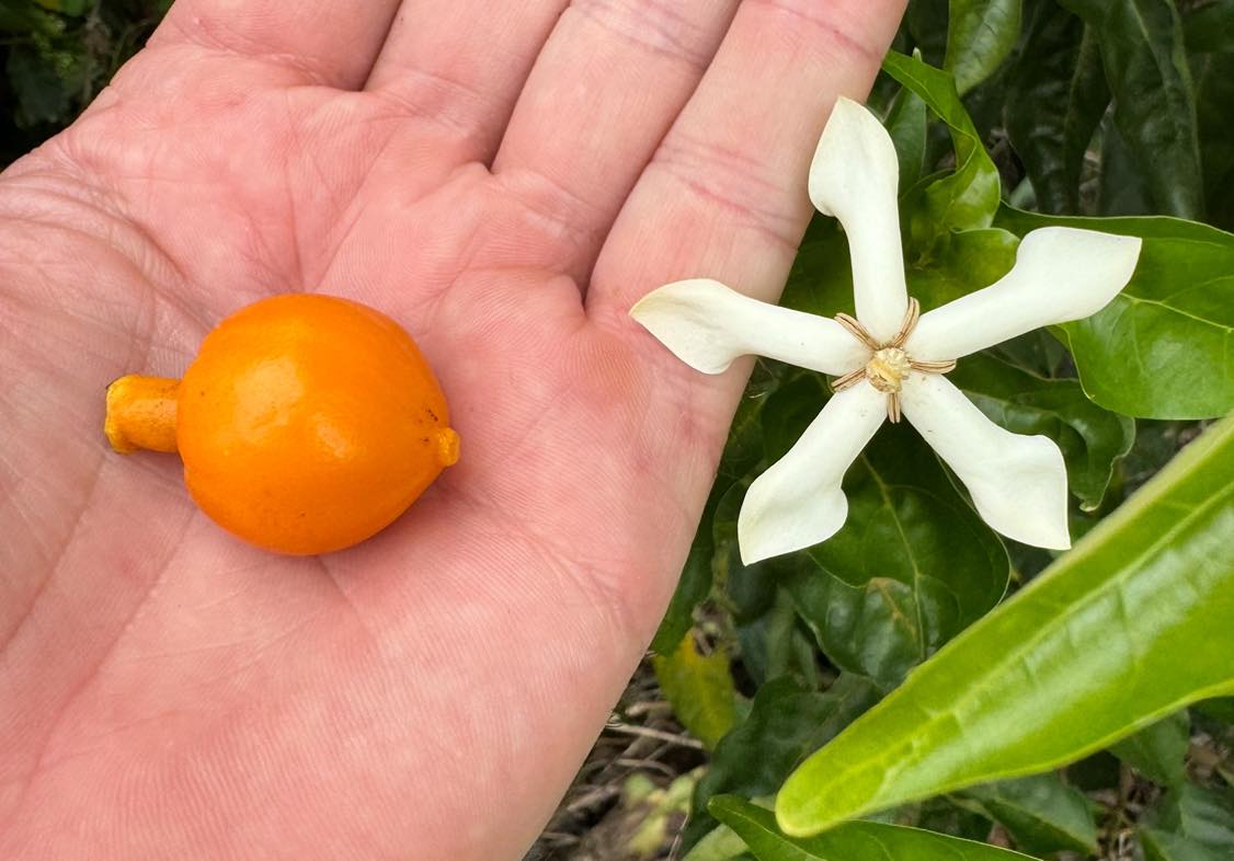 Unlike most gardenias, which are shrubs, the Daintree gardenia is a true rainforest tree growing up to 20 metres and features dark, glossy green leaves. From June to September, it produces small, yellow-green flowers, followed by hairy, green drupes that ripen into yellow or orange fruit.