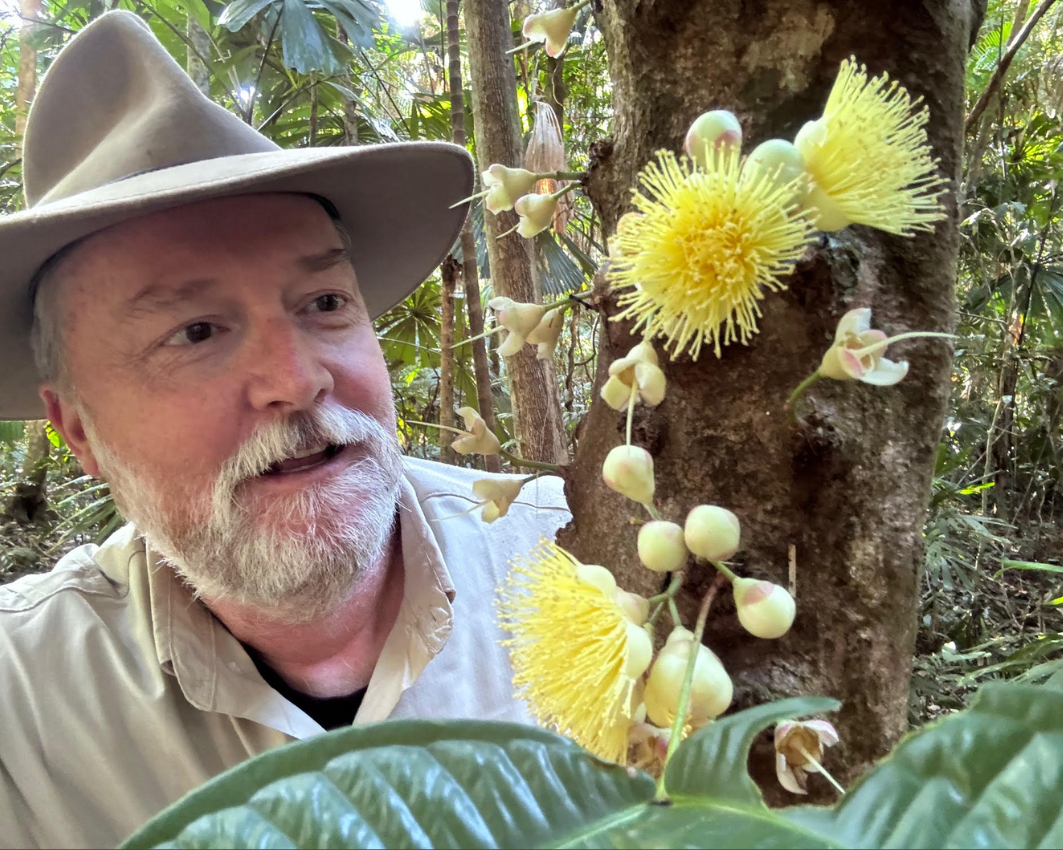 The Daintree Satinash (Syzygium monospermum), a member of the Myrtaceae family, is endemic to north-east Queensland. These majestic trees can reach heights of up to 17 metres and possess smooth, reddish-brown bark. Their trunks have slits that lead to hollows, providing a home for ants. When fully mature, the trees bear edible white fruit that typically measures around 36-41mm. The tree exhibits cauliflory, a unique botanical trait where flowers and fruits grow directly from the trunk or main branches.