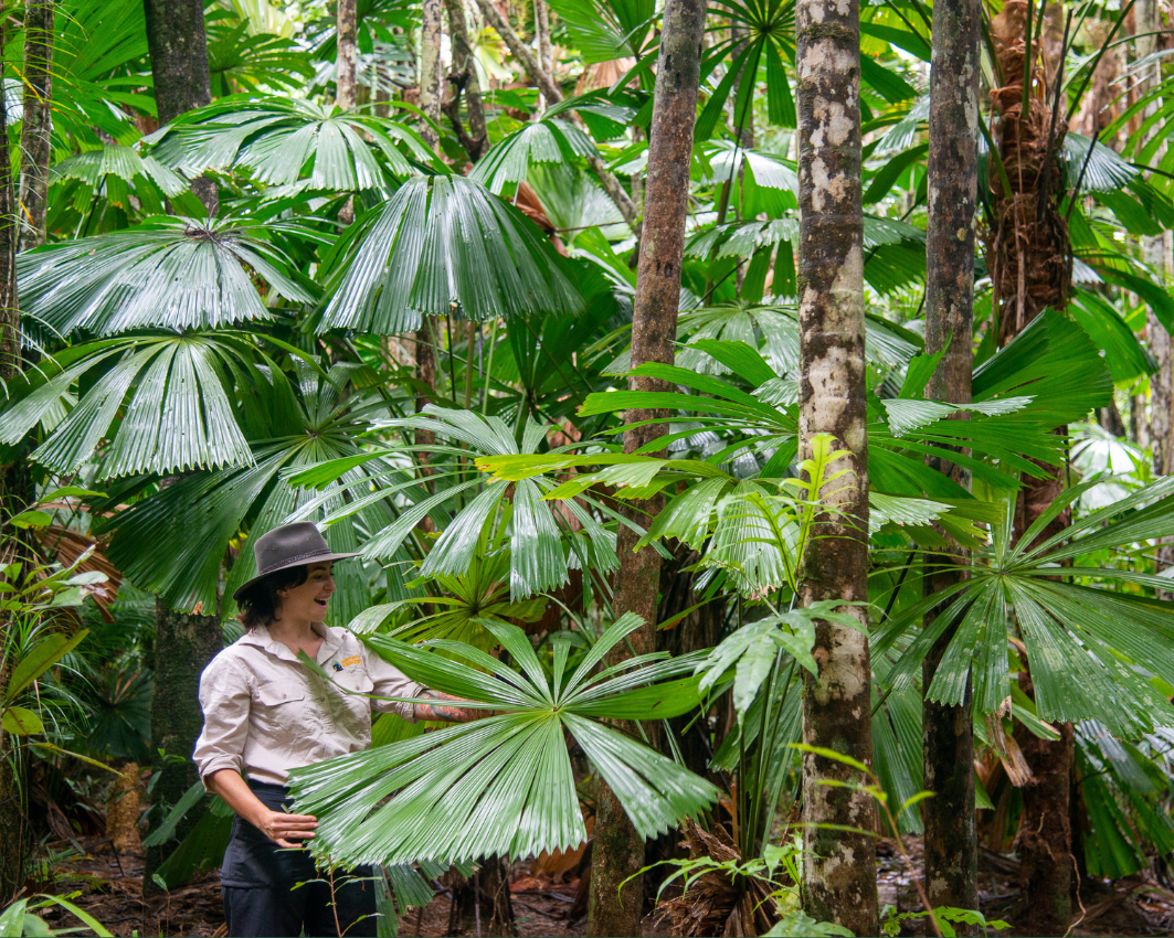 The fan palm (Licuala ramsayi) is an icon of the Daintree. This medium-sized, single-stemmed palm usually grows up to 15m in height, though it can reach 25m. It features a single, upright, and slim trunk that can be up to 20 centimetres thick. The top of the palm is adorned with expansive, fan-like foliage. These leaves, extending up to two meters, display delicate, feather-like segments that contribute to the palm's elegant look. The leaf segments are a vibrant green on the top side and have a silvery colour beneath.