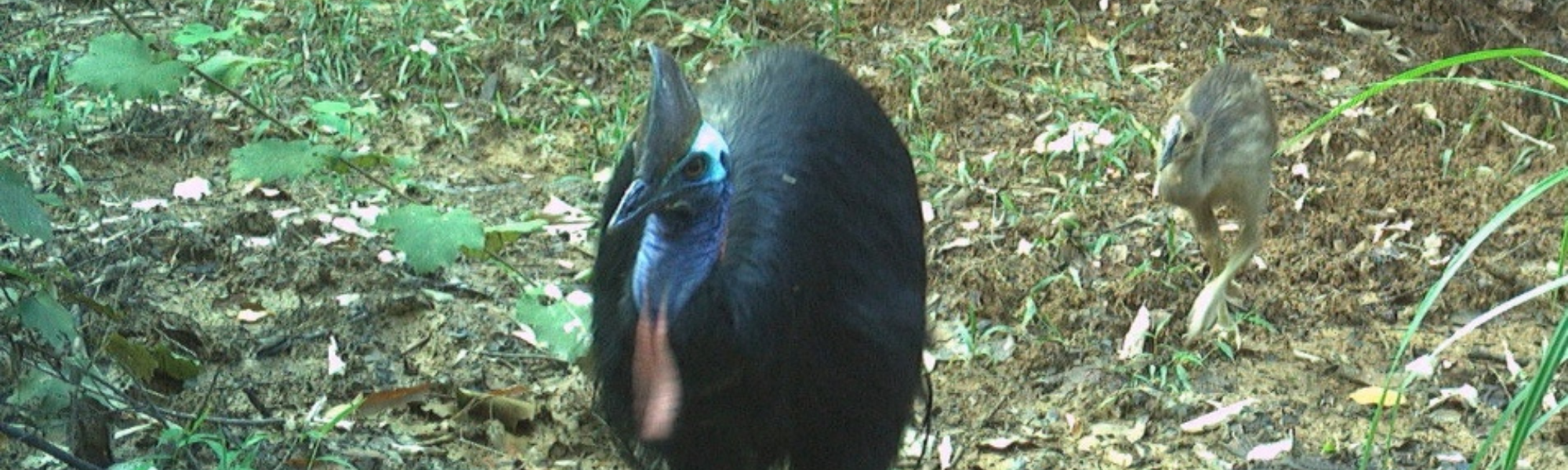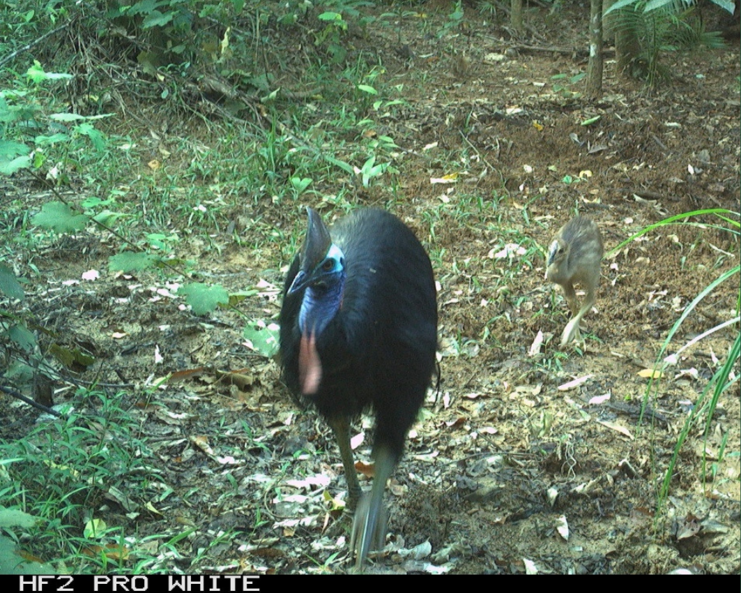 Perhaps the most exciting discovery was camera trap footage of a Southern Cassowary (Casuarius casuarius) with a stripey chick, recorded at four separate sites across the property.