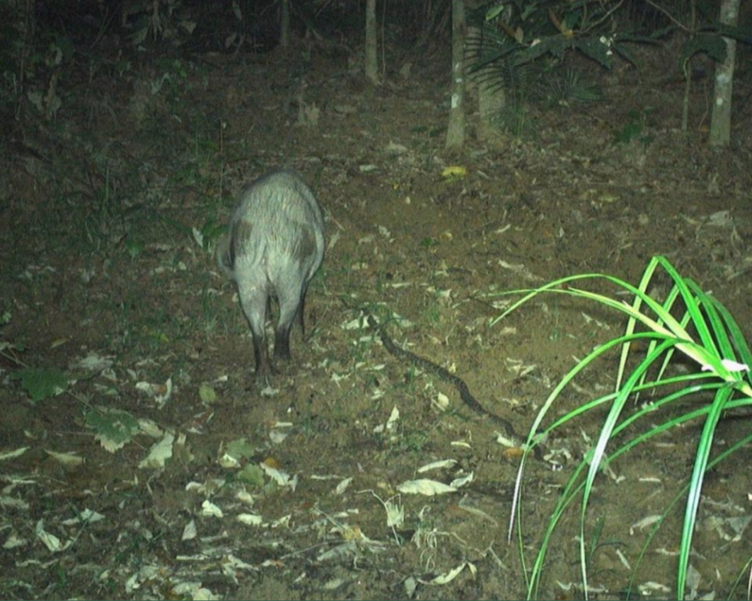 Trail cameras also captured a scrub python (Simalia kinghorni), Australia’s longest snake, passing a feral pig during the night. While the python was not large enough to threaten the pig, the interaction provides a fascinating glimpse into the hidden dynamics of rainforest life.