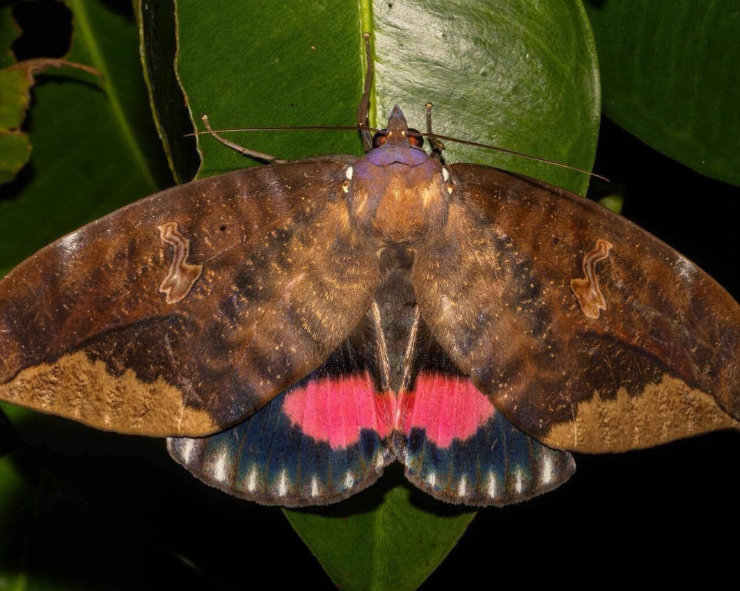 One of Australia's largest moths, the pink underwing moth (Phyllodes imperialis), is named for the brilliant pink spots present on its otherwise dark rear wings. They possess forewings that resemble the shape of a leaf, coloured in shades of grey and brown, and dotted with white on the lower side.