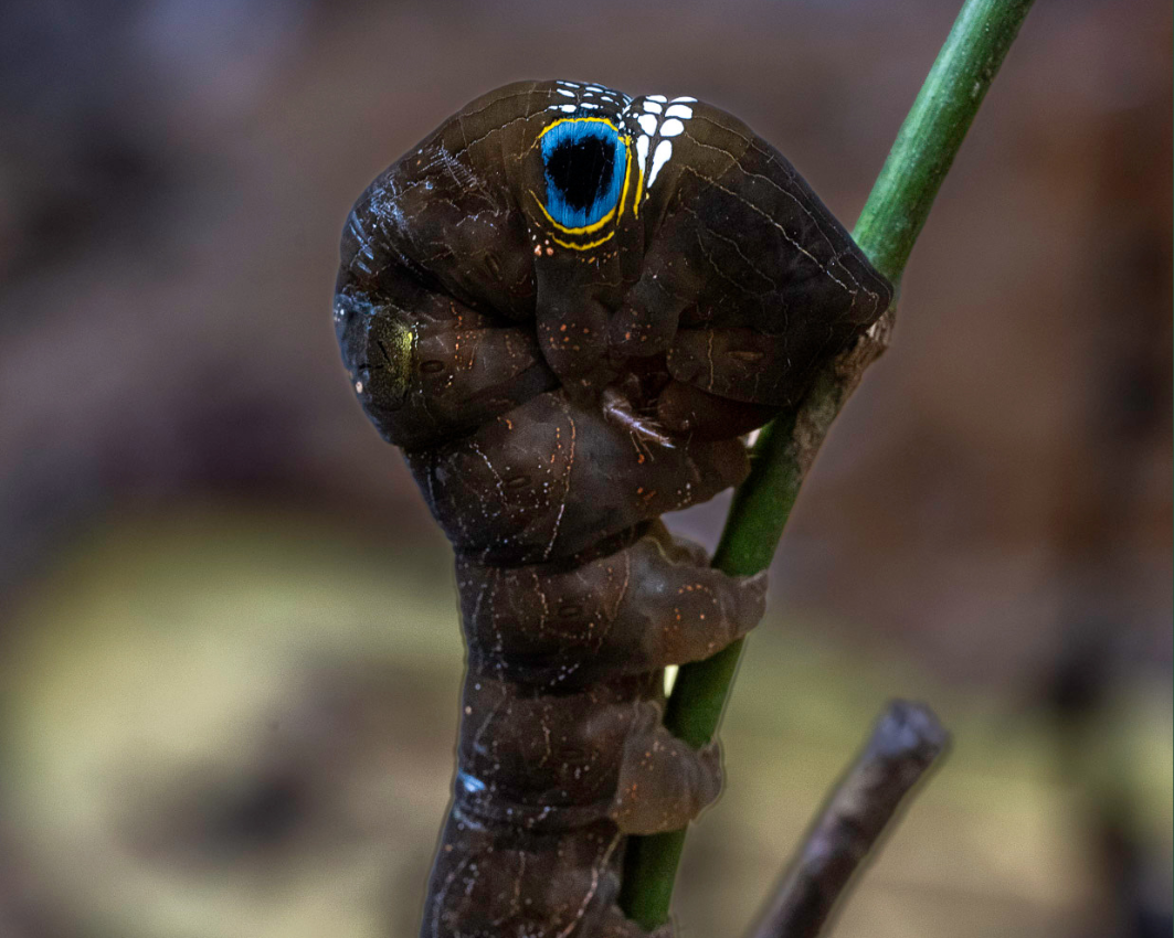 Their caterpillars are one of the world’s most exotic and eccentric-looking. They evolve from a muted brown colour to displaying two prominent 'eye' markings, with a dual line of white 'teeth' markings situated between these mimic eyes.